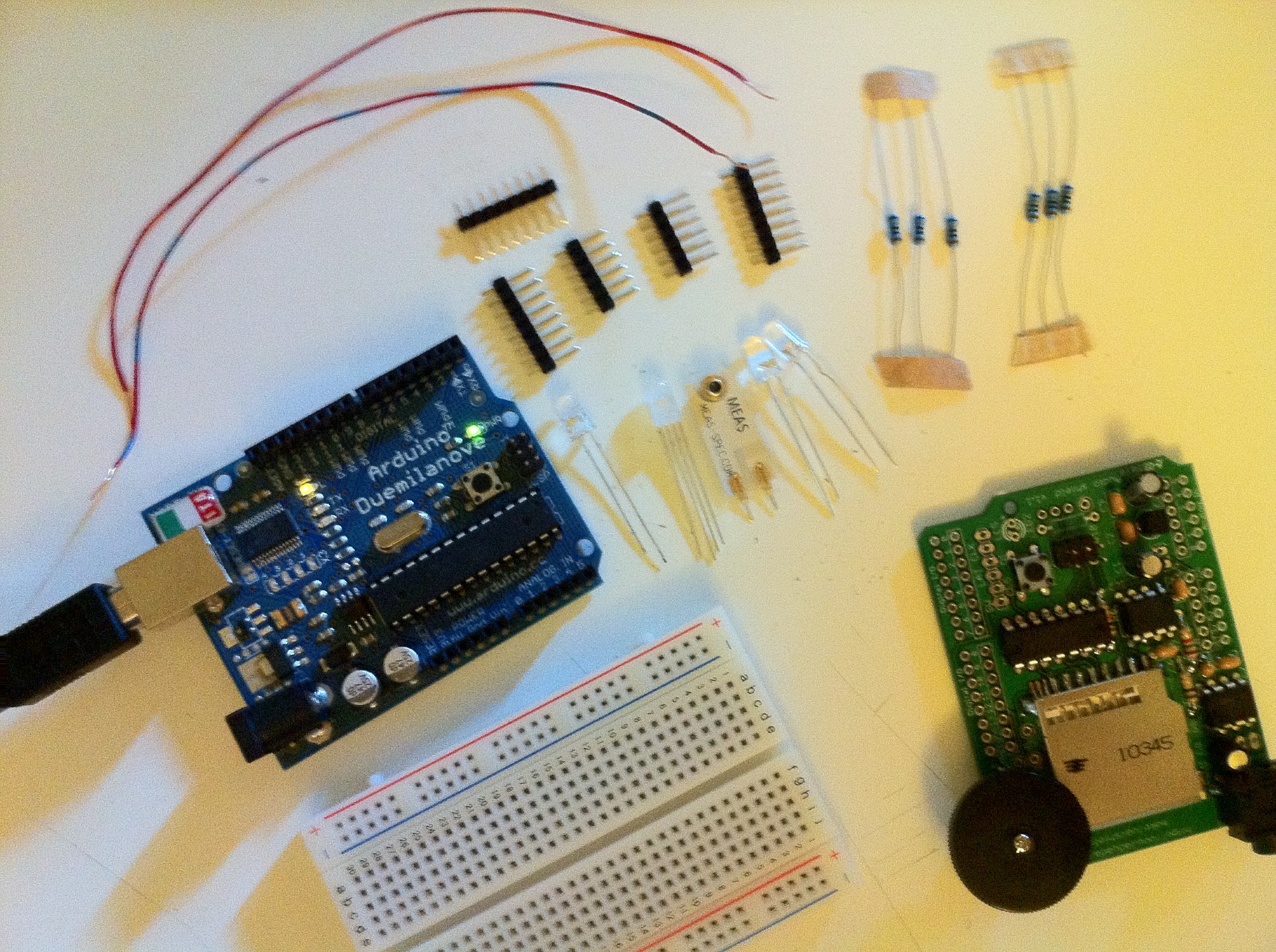 Using jiggle sensors, LEDs, speakers, and audio configuration, we constructed a prototype of what the final product would be.